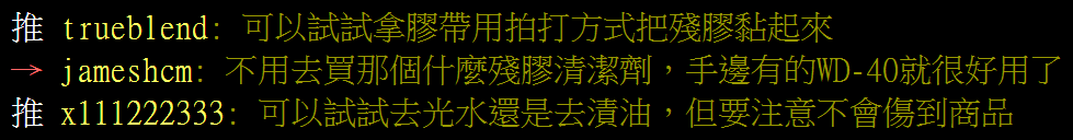 有 PTT 網友詢問如何去除標籤的殘膠,下面網友大部分都推薦 3M 除膠劑,甚至網友 purplebfly 說:「不能買雜牌,只有3M最有效」。